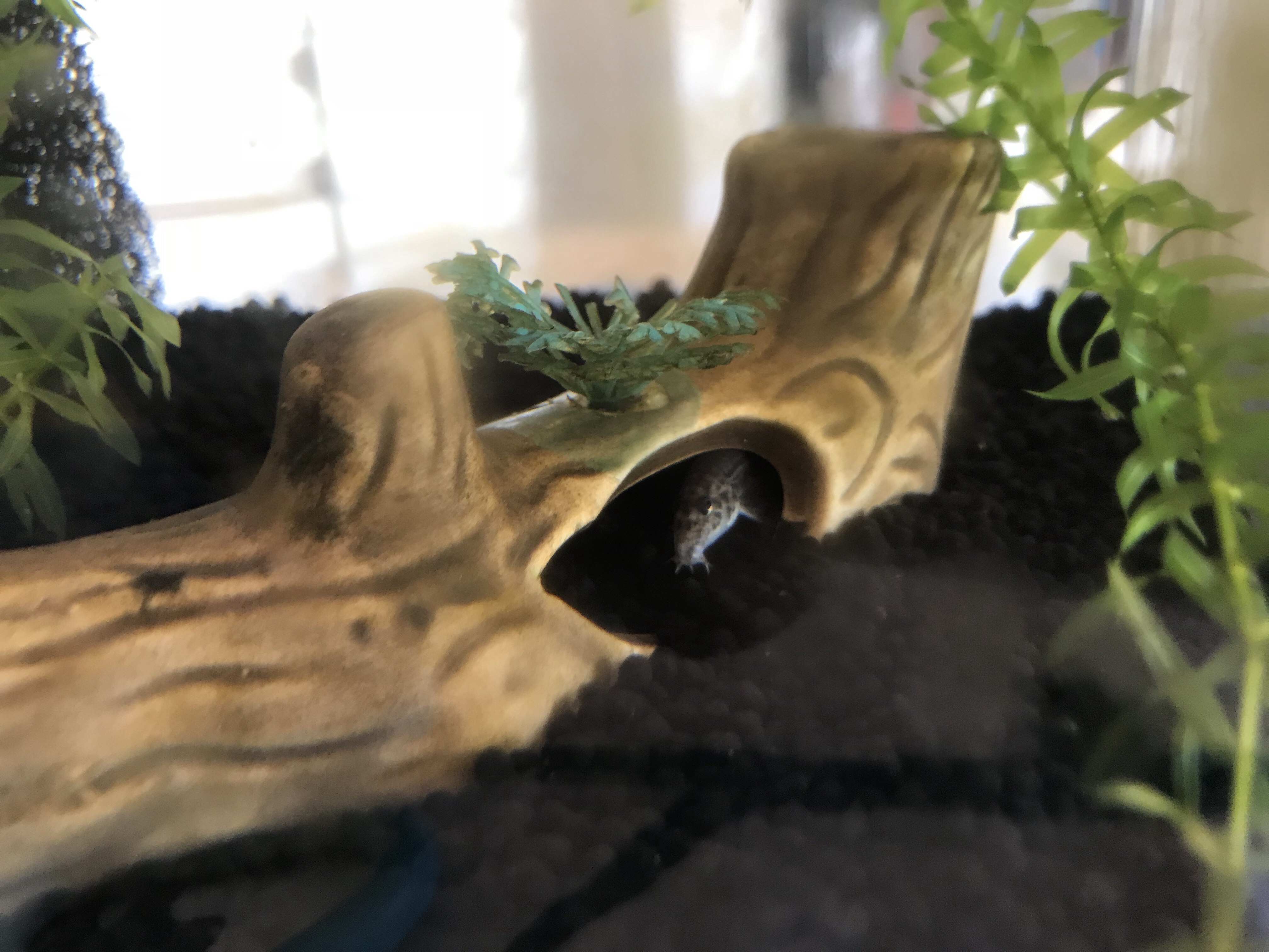 この時は水を変えたばかりで水位が上がってカーペットに飛び出て、フローリングのところで死んでいました。